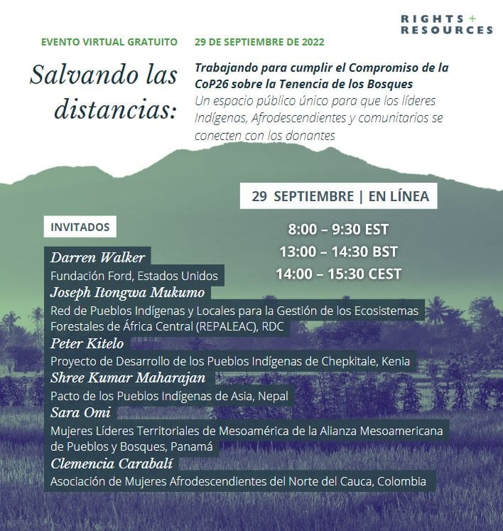 El 29 de septiembre de 2022, RRI y el Grupo de Trabajo de Donantes organizaron un debate virtual entre los Pueblos Indígenas y las comunidades locales y los donantes de un compromiso histórico de 1.700 millones de dólares realizado en 2021 en la CoP26 para apoyar a estos grupos. Este diálogo ofreció una oportunidad única para que los miembros de las comunidades indígenas y locales se pusieran en contacto directamente con los donantes de la promesa, y recibieran información actualizada y respuestas a sus preguntas sobre el compromiso.