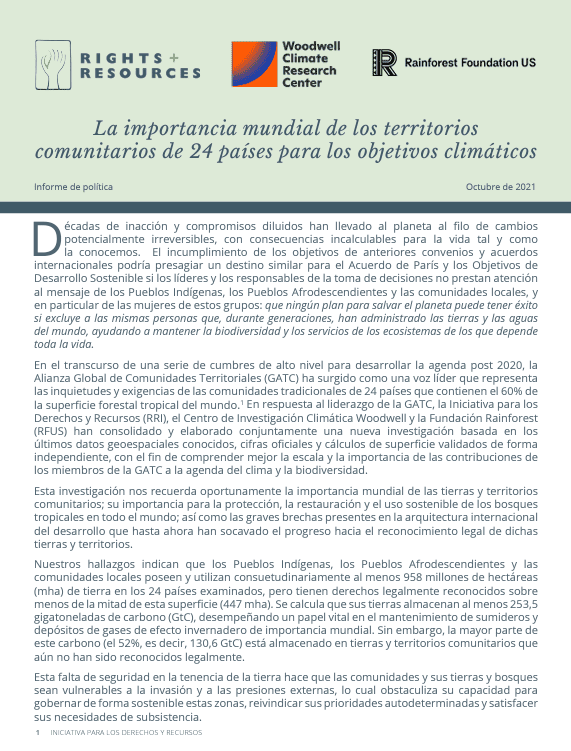 Nuestros hallazgos indican que los Pueblos Indígenas, los Pueblos Afrodescendientes y las comunidades locales poseen y utilizan consuetudinariamente al menos 958 millones de hectáreas (mha) de tierra en los 24 países examinados, pero tienen derechos legalmente reconocidos sobre menos de la mitad de esta superficie (447 mha). Se calcula que sus tierras almacenan al menos 253,5 gigatoneladas de carbono (GtC), desempeñando un papel vital en el mantenimiento de sumideros y depósitos de gases de efecto invernadero de importancia mundial. Sin embargo, la mayor parte de este carbono (el 52%, es decir, 130,6 GtC) está almacenado en tierras y territorios comunitarios que aún no han sido reconocidos legalmente.