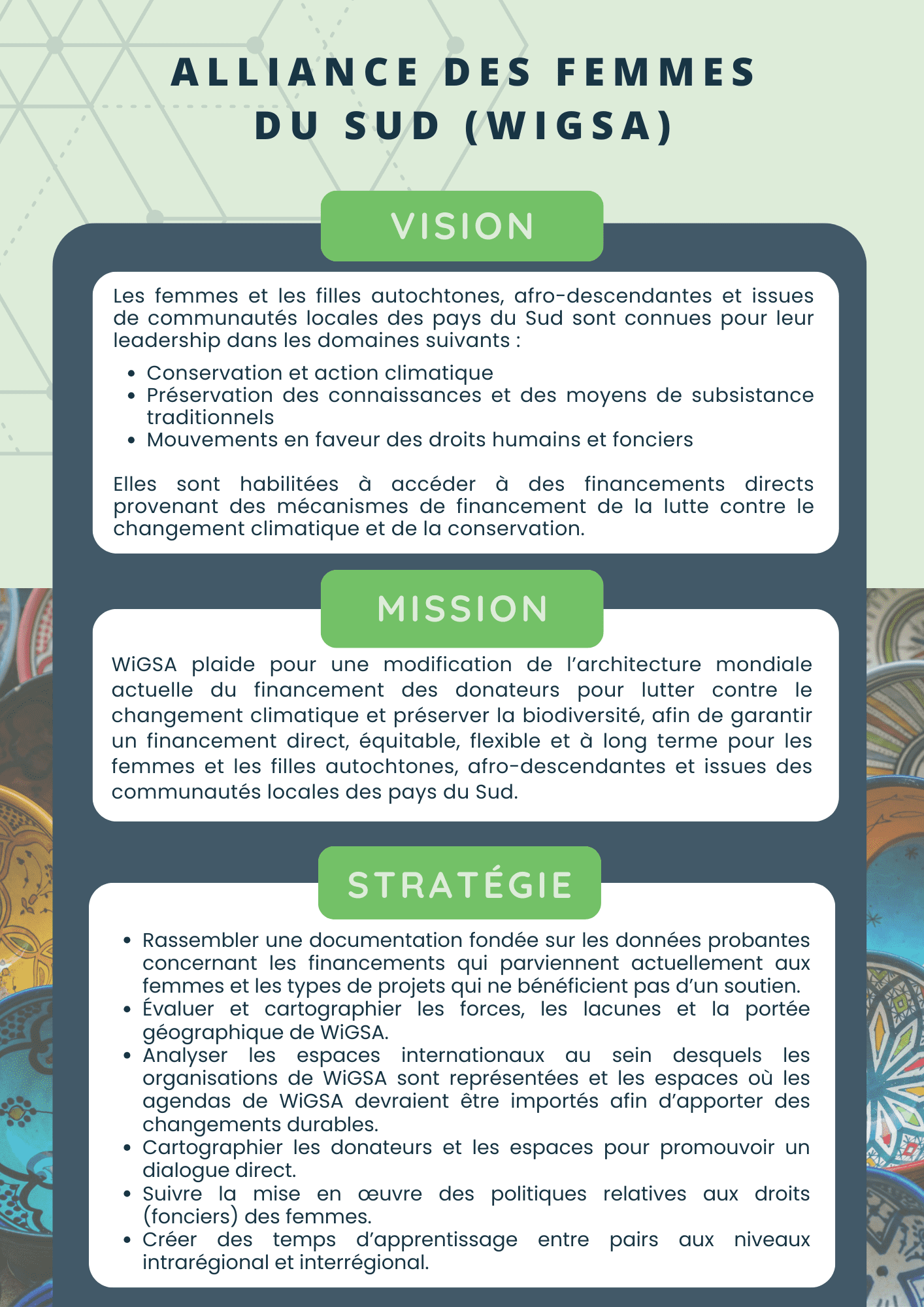 • WiGSA rassemble les voix, les points de vue, les connaissances et la diversité des agendas pour la défense des droits des femmes et leurs stratégies pour opérer des changements systémiques aux niveaux local, national et international.