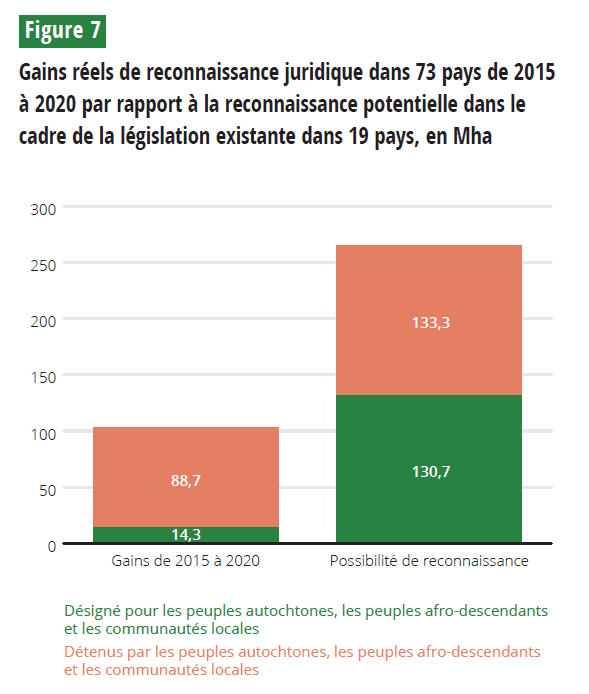 Entre 2015 et 2020, les gouvernements nationaux de 39 pays, à travers tous les continents habités, ont reconnu les droits fonciers des peuples autochtones, des peuples afro-descendants et des communautés locales sur plus de 100 millions ha de terres qui ne l’étaient pas auparavant. Il s’agit là d’un progrès qui mérite d’être célébré, et chaque hectare reconnu est le produit d’un plaidoyer inlassable des militants communautaires et de leurs alliés.
