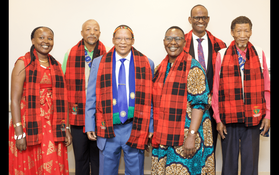 De gauche à droite : Kendi Borona, RRI ; Khan//an /ukxa, Senior cónsul de l’autorité traditionnelle de Namibie ; Hon. Royal Johan Kxao IUiloloo, Ministre adjoint des communautés marginalisées, Namibie ; Fiesta Warinwa, AICA ; Hon. Endrias Geta, Ministre d’État, ministère de l’irrigation et des basses terres, Éthiopie ; Chief Langman de l’autorité traditionnelle de Namibie. Photo par Matthew Sky Angula, Venture Media pour RRI.