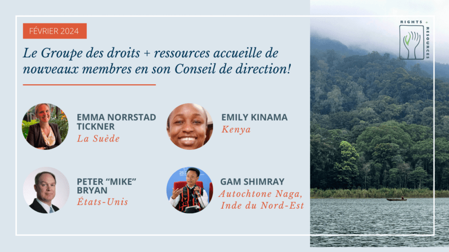 Washington, DC (le 13 février 2024) — Le Conseil de direction du Groupe des droits et ressources (RRG) a nommé en tant que nouveaux membres trois figures internationales de la défense des droits environnementaux, financiers et humains : Emma Norrstad Tickner de Suède ; Emily Kinama du Kenya ; et Peter « Mike » Bryan des États-Unis. Elles et il rejoignent Gam Shimray, le leader autochtone Naga du Nord-Est de l’Inde, déjà nommé en octobre 2023.