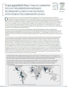 Ce dossier résume les conclusions de la première évaluation comparative internationale sur la mesure dans laquelle les différents cadres juridiques nationaux reconnaissent les droits des peuples autochtones et des communautés locales en matière d’eau douce, ainsi que les droits spécifiques des femmes à utiliser et à gérer les eaux communautaires. Cette analyse est le fruit d’une collaboration entre l’Environmental Law Institute et l’Initiative pour les droits et les ressources (Rights and Resources Initiative), qui héberge le seul programme de recherche au monde consacré à la surveillance de l’état des droits fonciers, forestiers et d’eau douce des communautés, et qui sera élargie et mise à jour au fil du temps.