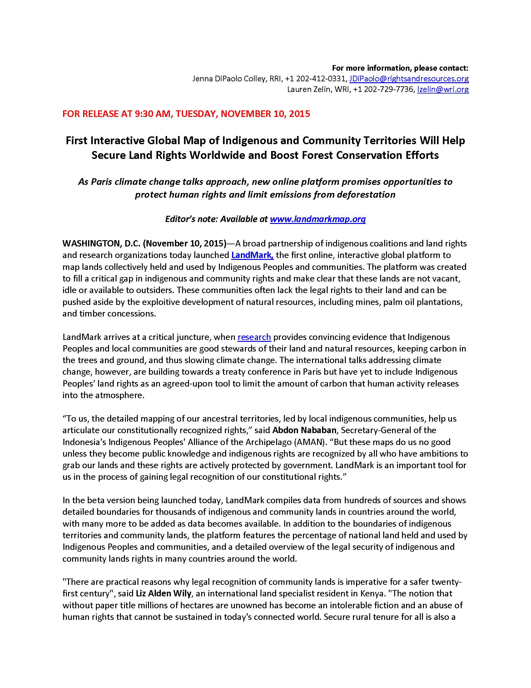 A broad partnership of indigenous coalitions and land rights and research organizations today launched LandMark, the first online, interactive global platform to map lands collectively…