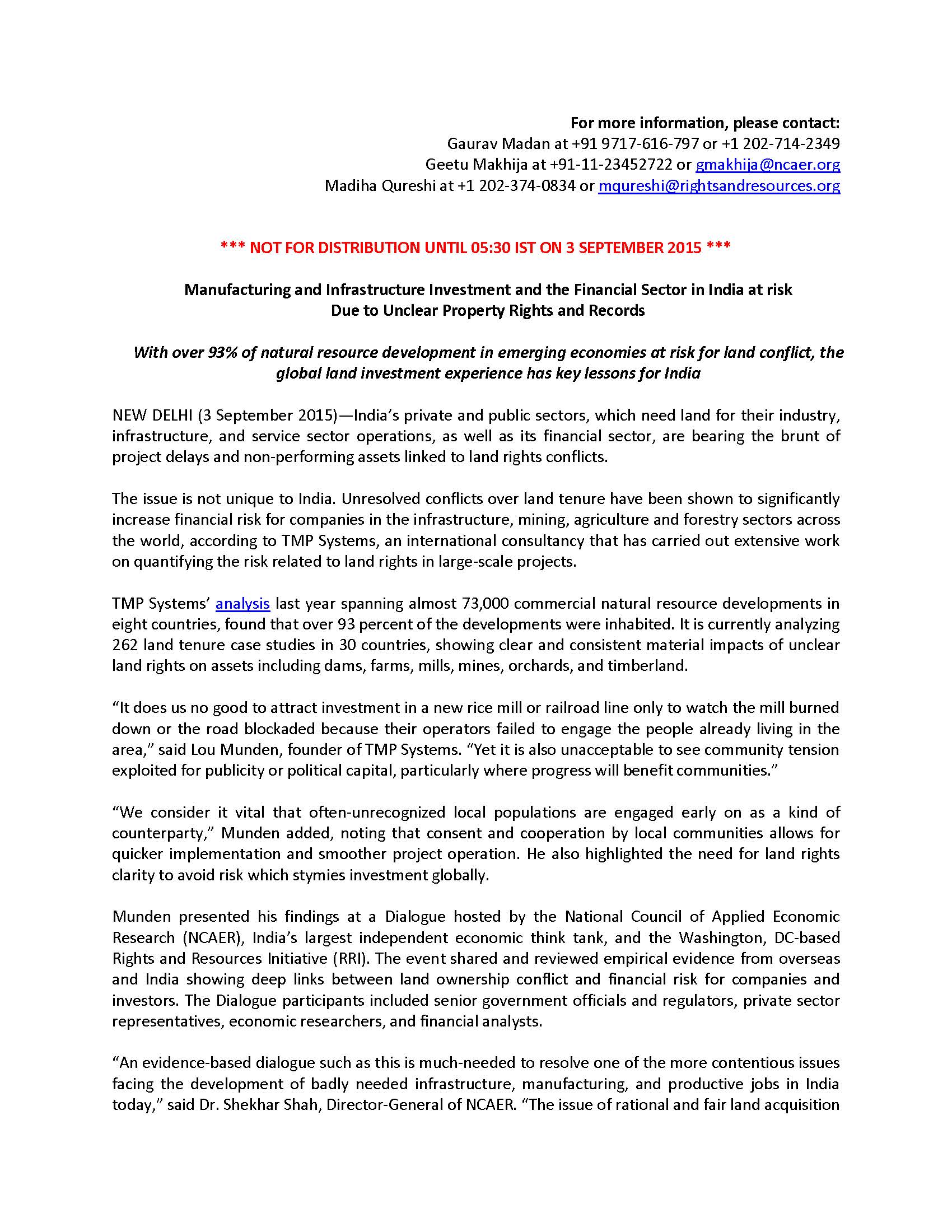 With over 93% of natural resource development in emerging economies at risk for land conflict, the global land investment experience has key lessons for India.