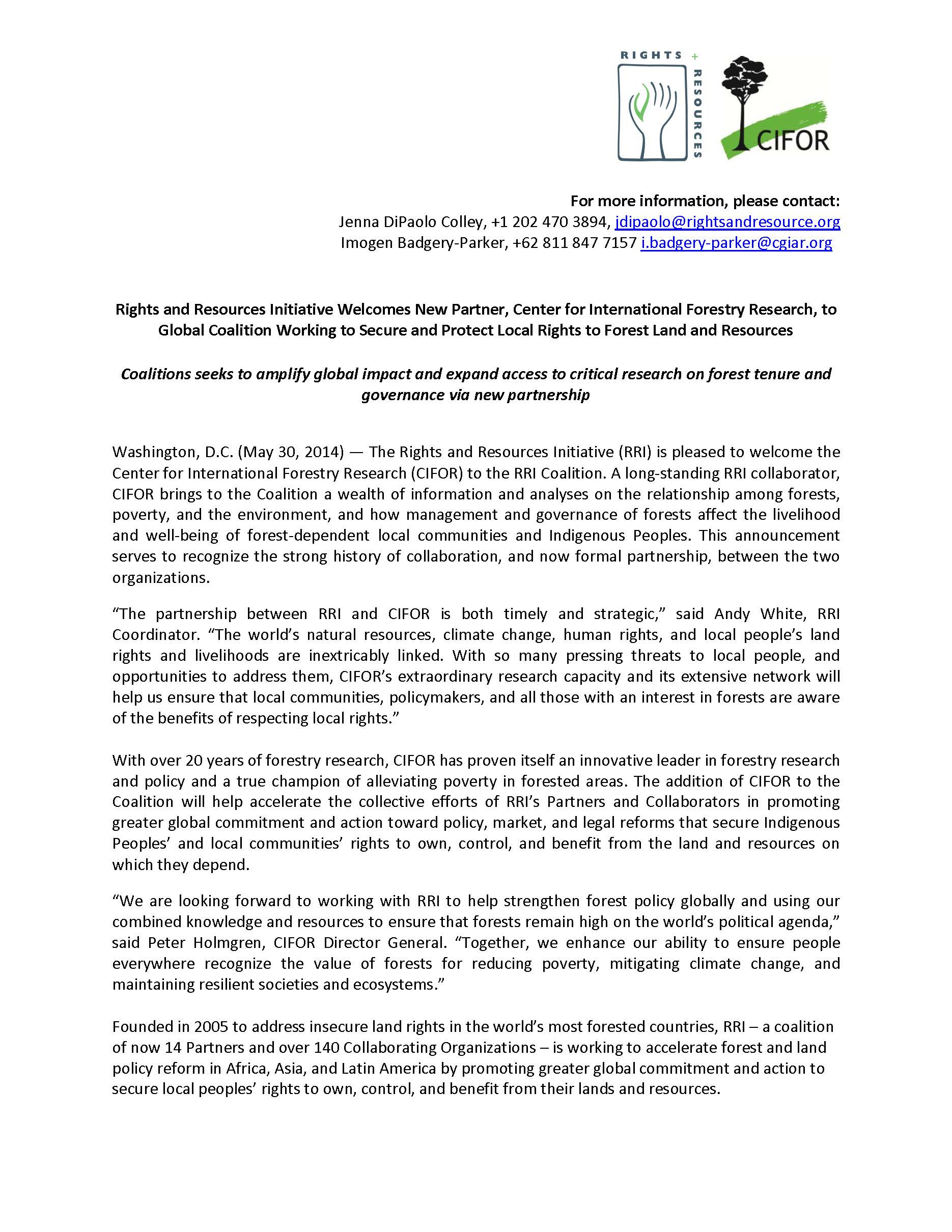 Washington, D.C. (May 30, 2014) — The Rights and Resources Initiative (RRI) is pleased to welcome the Center for International Forestry Research (CIFOR) to the…